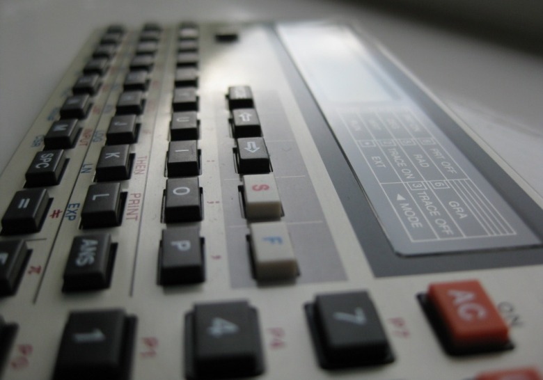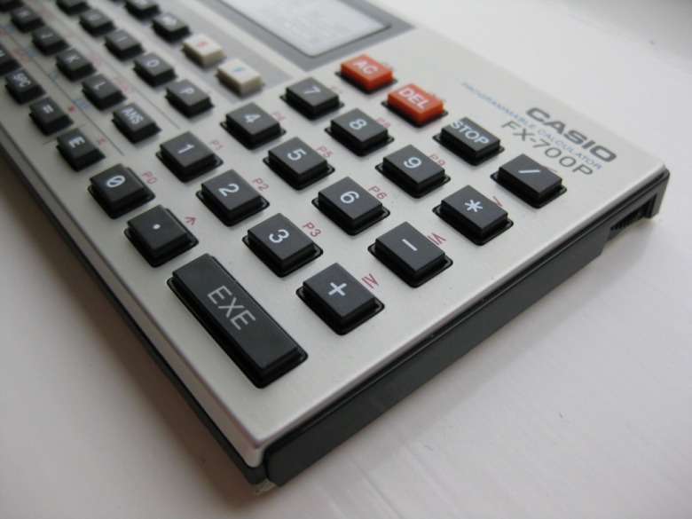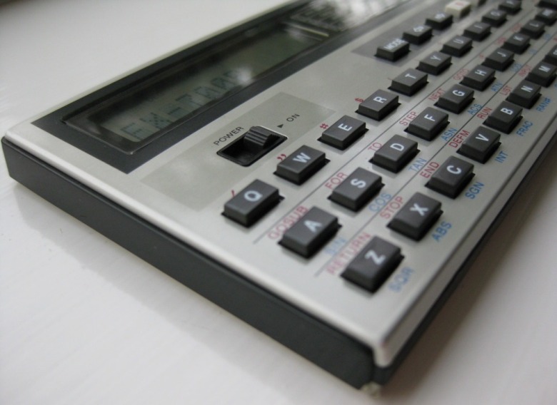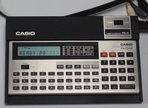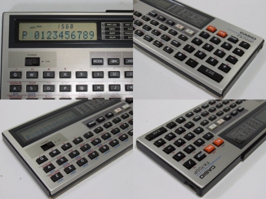 C'est le PB-100 avec la touche F permettant d'accéder aux fonctions mathématiques prédéfinies en bleu sous les touches caractères.  Du coup, par manque de place, les caractères accessibles avec le mode EXT ne sont plus inscrits sous les touches caractères